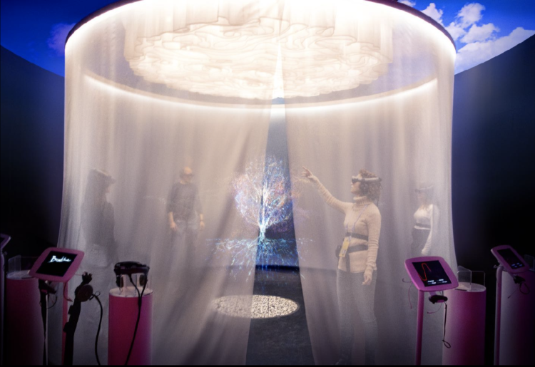 The experience uses biometric sensors and real-time meteorological data to make a usually invisible phenomenon visible and create an emotional and sensory connection between participants and other living beings represented in the experience.