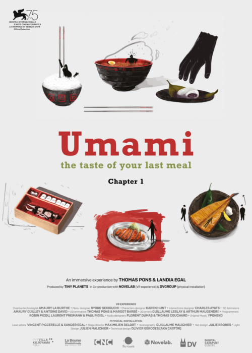 Umami is an immersive theatre experience in which the user steps into the shoes of a character sentenced to death and preparing to enjoy the multi-sensory experience of their last meal. This highly interactive experience subtly blends 2D and 3D, the real and the virtual, and, through the phenomenon of ‘Proust's madeleine’, the character's present and past, life, death and memories.